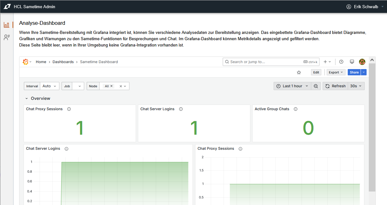 - Once all Sametime services are running, start Prometheus followed by Grafana. You should then be able to see the dashboard embedded in the Sametime Admin Web UI.