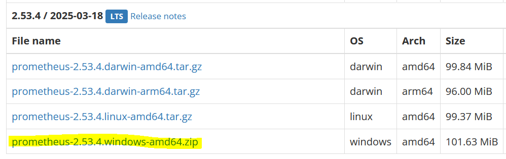 - Download the latest Prometheus 2.53.x LTS release https://prometheus.io/download/