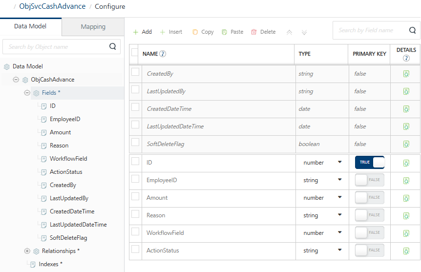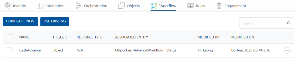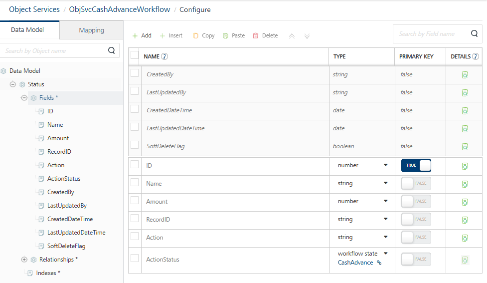 Create 2 objects in the object services. One for the business record ( ObjSvcCashAdvance ) and one for the workflow ( ObjSvcCashAdvanceWorkflow ). In this way, there is a separation of business records and workflow instances. To terminate a workflow instance, the object that triggers the instance will need to be deleted, hence having a separate object will ensure that the business records will not have to be deleted (regardless whether it is a soft delete or hard delete).