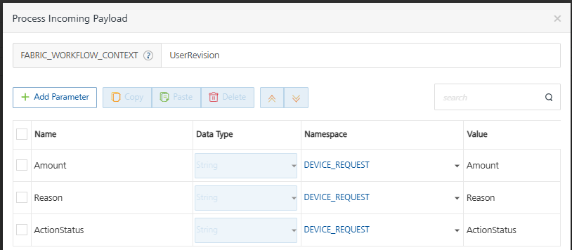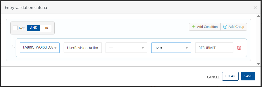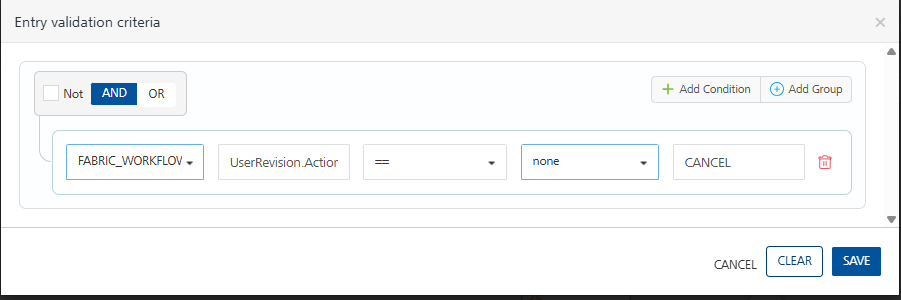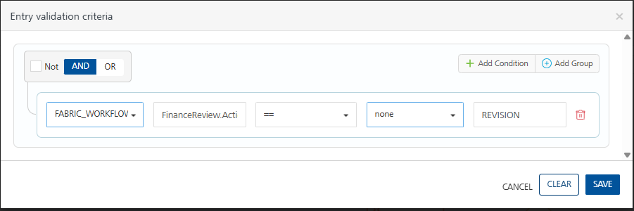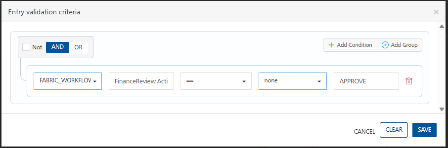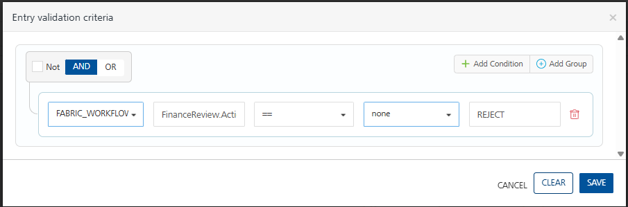 From the User Decision Gateway, click on the connecting line to Finance Review and edit in the Entry Validation Criteria and enter the condition shown in Image 5 (note the name of the Fabric_Workflow_Context is from the Process Incoming Payload of User Task). This ensures that only an amount > 5000 and action status is “REVIEW” will require finance review.