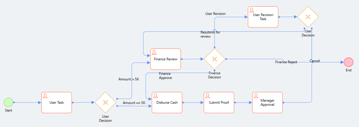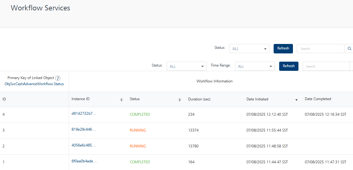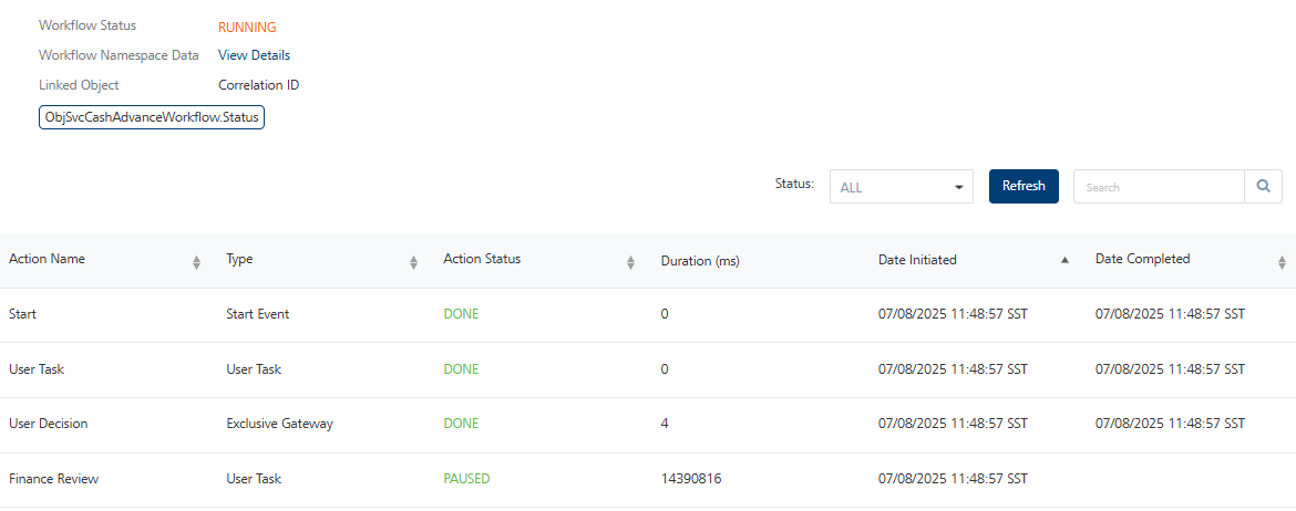 From this point on, keep updating the ActionStatus in the API call to walk through the instance to verify if all the different actions and path are completed successfully. Also try deleting the records in the ObjSvcCashAdvanceWorkflow to see the instance being terminated.