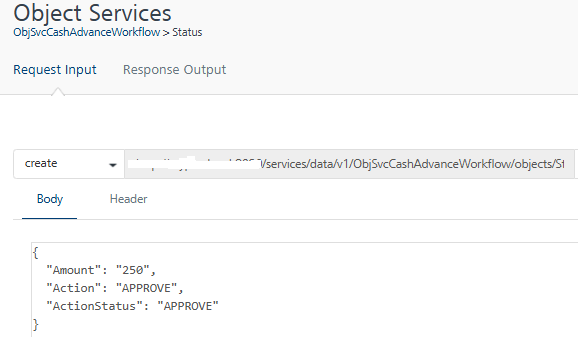 To test the workflow, click on Object Services > ObjSvcCashAdvanceWorkflow, select Status from the dropdown under App Data Model Objects. This will open the page to the REST API call for the object. Since the objective is just to test whether the workflow will work, enter the following and click on the Get Response button. Be aware that the action need to be inline with the workflow’s Valid state transitions (see the individual steps above for the correct actions), otherwise it will not start.