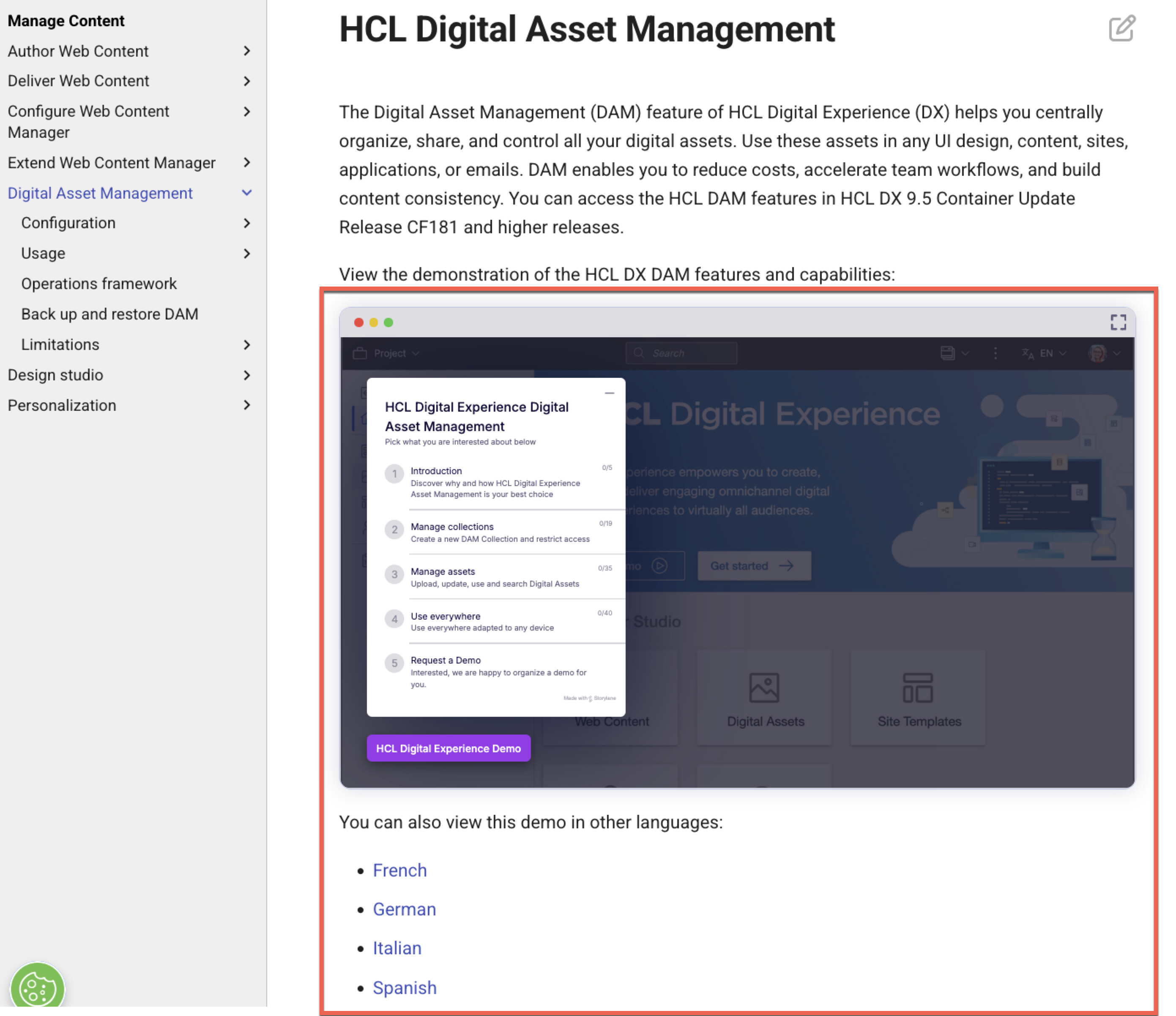 View a demonstration of the HCL DX DAM features and capabilities in English, French, German, Italian or Spanish in the Help Center: https://help.hcl-software.com/digital-experience/9.5/latest/manage_content/digital_assets/