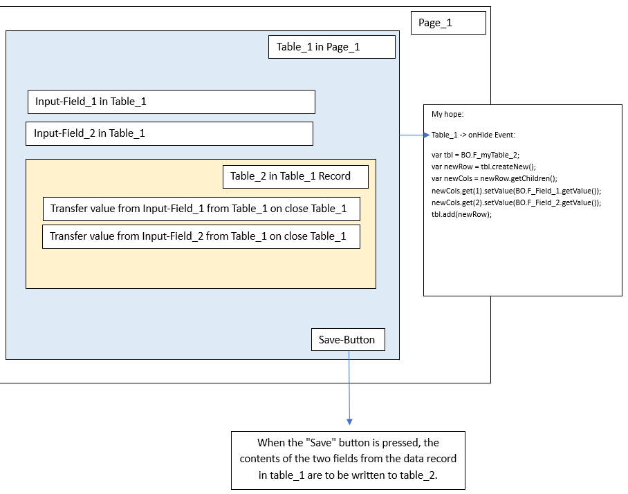 I have packed my use case into a graphic. Pictures say more than words :-) Specifically, it is about transferring the content of two fields to a table (Table_2) when leaving the table (Table_1). Table_2 is located in Table_1. The onHide method would be well suited for this. I can of course take a diversion and check all other fields when changing each field (onChange) and generate the table entry in Table_2 from this when Table_1 is open. It's more work, but maybe it would be a solution.