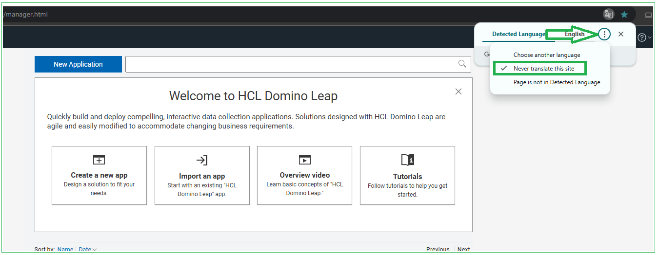 2. Go to Domino Leap manager site "/volt-apps/secure/org/ide/manager.html".