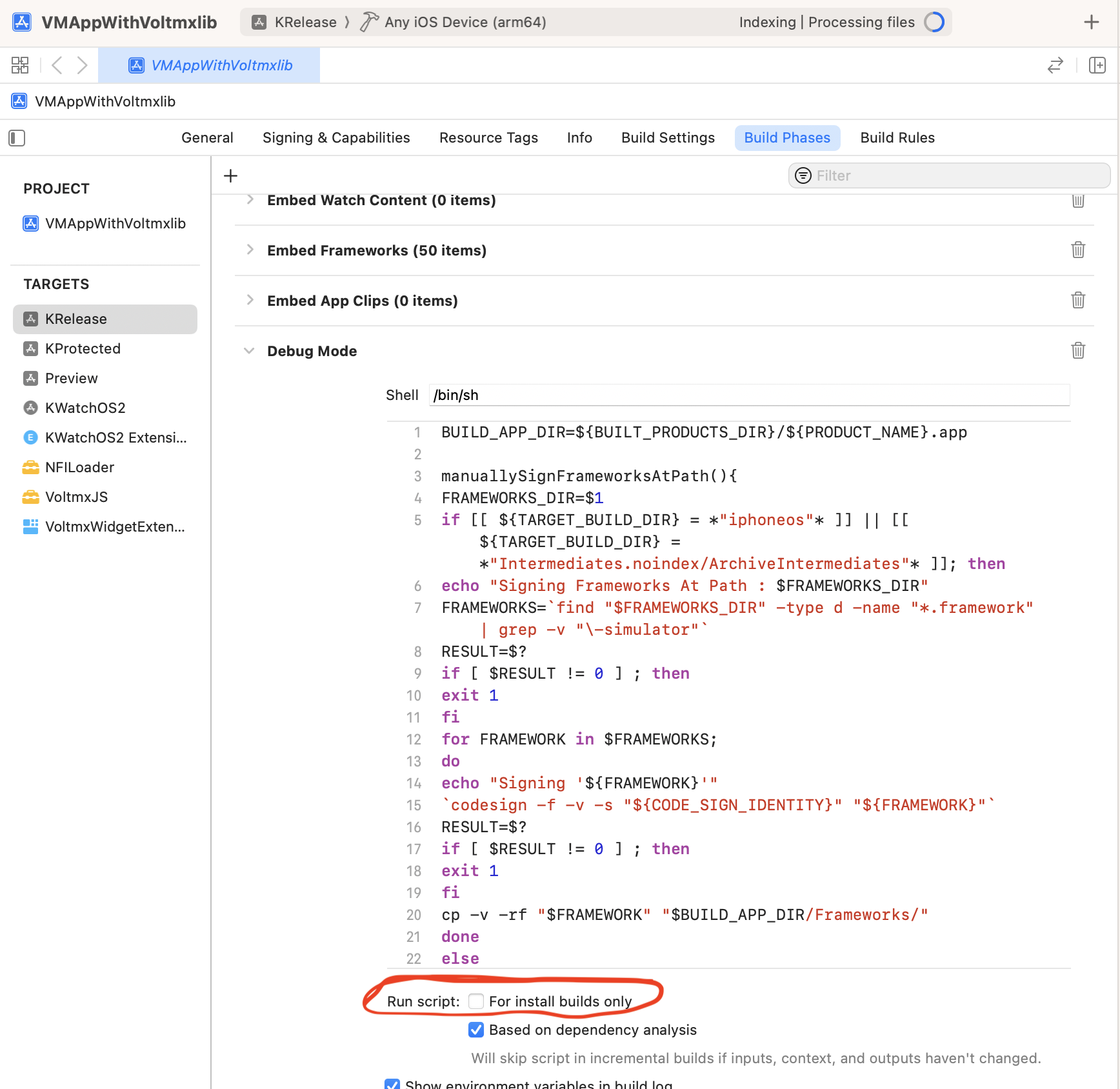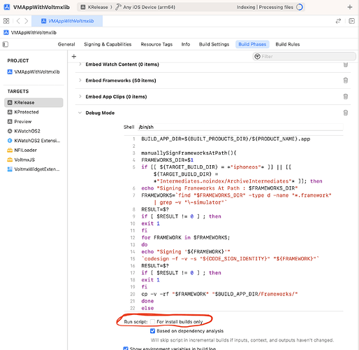 In KRelease -> Build Phases -> DebugMode -> Please enable the checkbox the Runscript for Install builds.