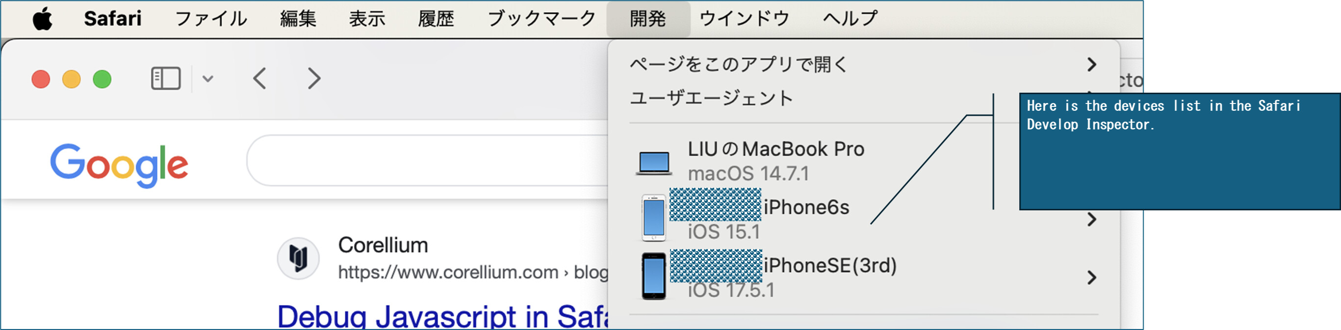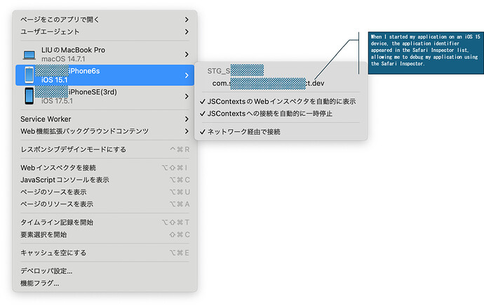 ④When I started my application on an iOS 15 device, the application identifier appeared in the Safari Inspector list, allowing me to debug my application using the Safari Inspector.