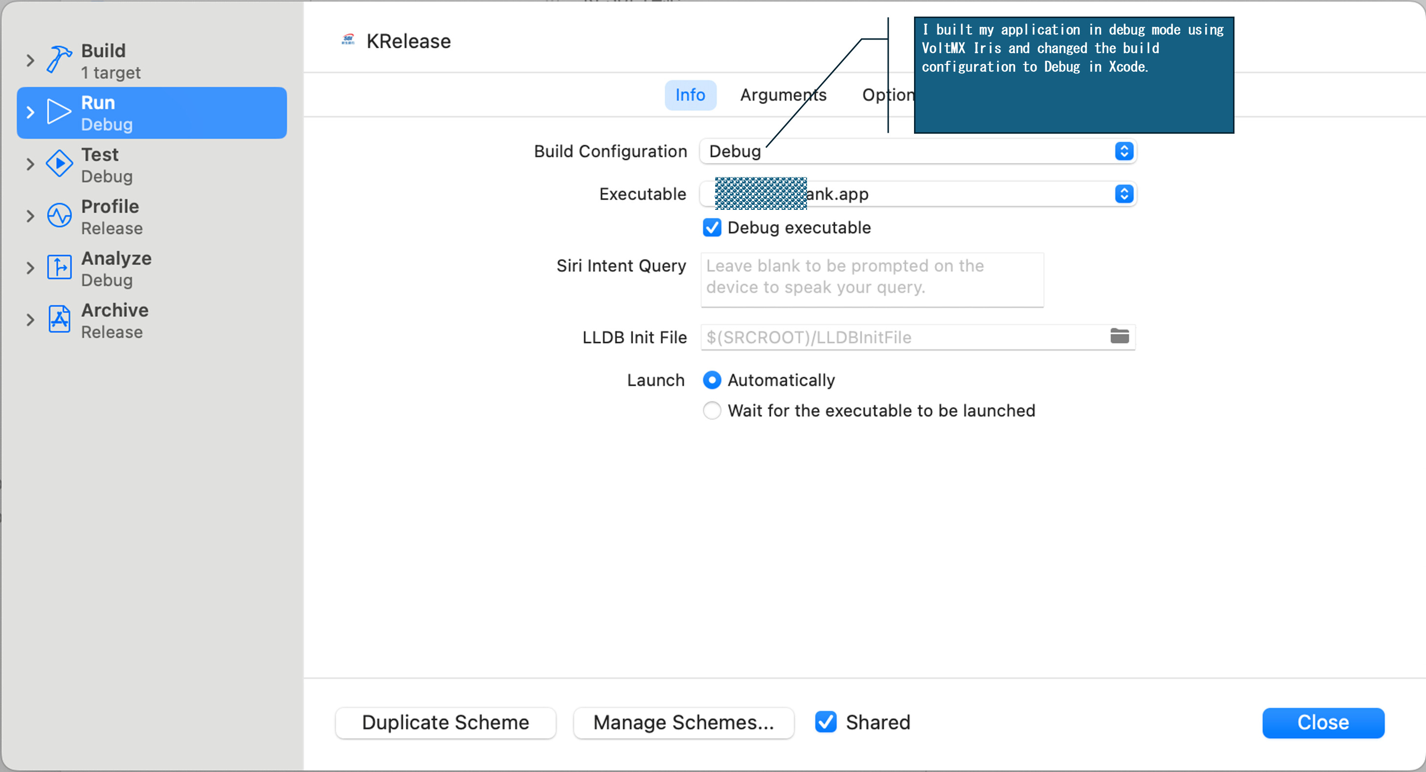②I built my application in debug mode using VoltMX Iris and changed the build configuration to Debug in Xcode.