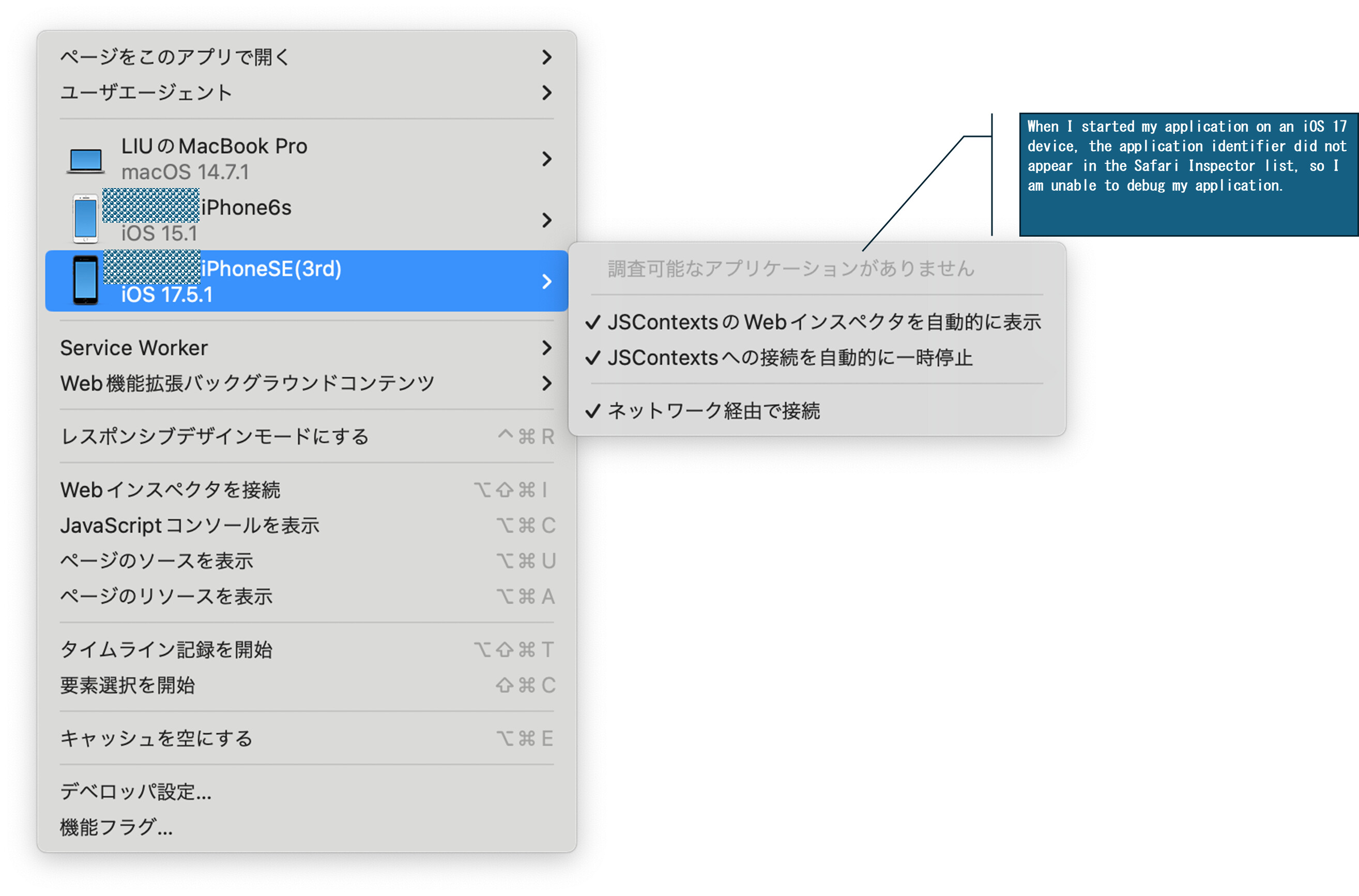 ⑤When I started my application on an iOS 17 device, the application identifier did not appear in the Safari Inspector list, so I am unable to debug my application.