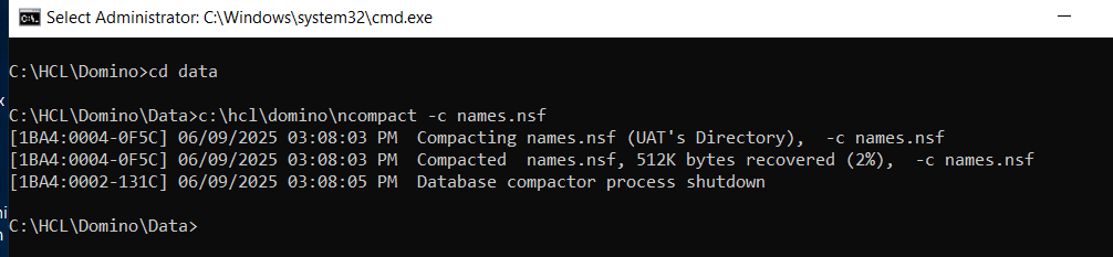 Now you can run your compact from within the server context by issuing $C:\Program Files\HCL\Domino\ncompact.exe -c names.nsf