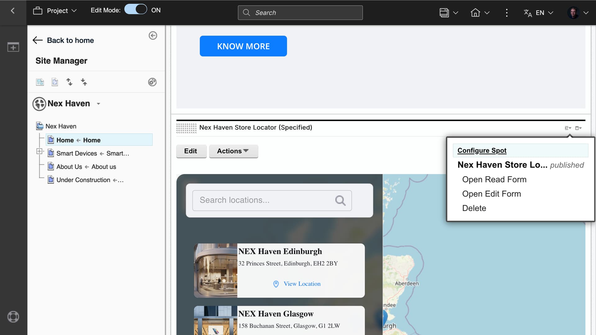 Here you see a DX site with a provided sample React Script Application Store locator that may be configured and targeted to any device, audience or other rule, using the Configure Spot.