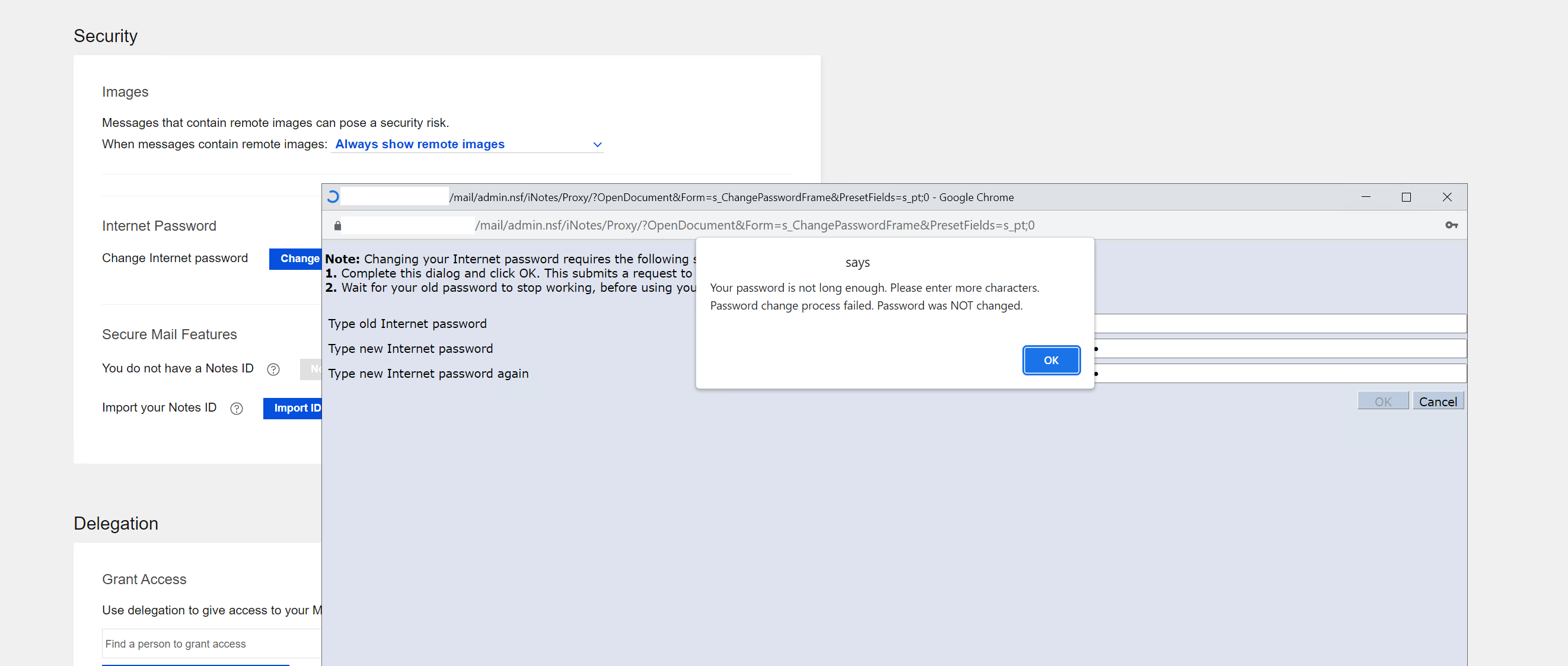 Kindly allow time for the changes to replicate across the Domino server and for the $Policies view to index on the server serving the user. After this, please try changing the password again and verify whether the error still occurs.